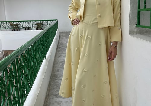 • The Jacket: Cropped with a classic collar and detailed cuffs, finished with elegant buttons for a polished look.