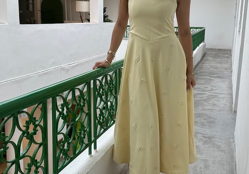 • The Dress: Features a relaxed yet elegant cut with subtle embroidery that adds a luxurious feminine touch.
