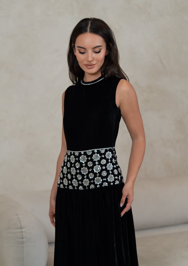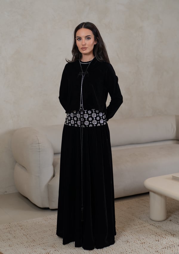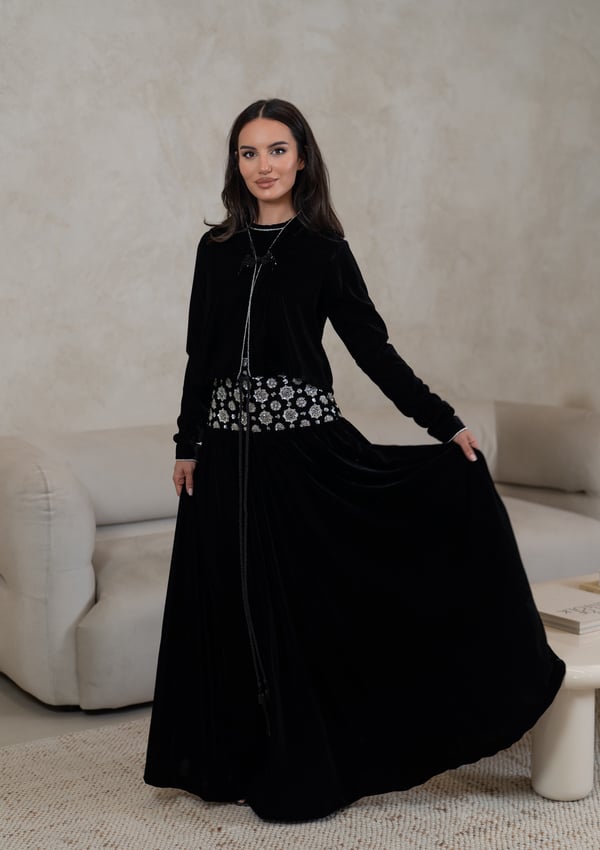 الدريس الخام مخمل اسود دمجنا مع خصوصا الأرداف مخمل تطريز الهندي مع قصه كلوش والزم خفيف